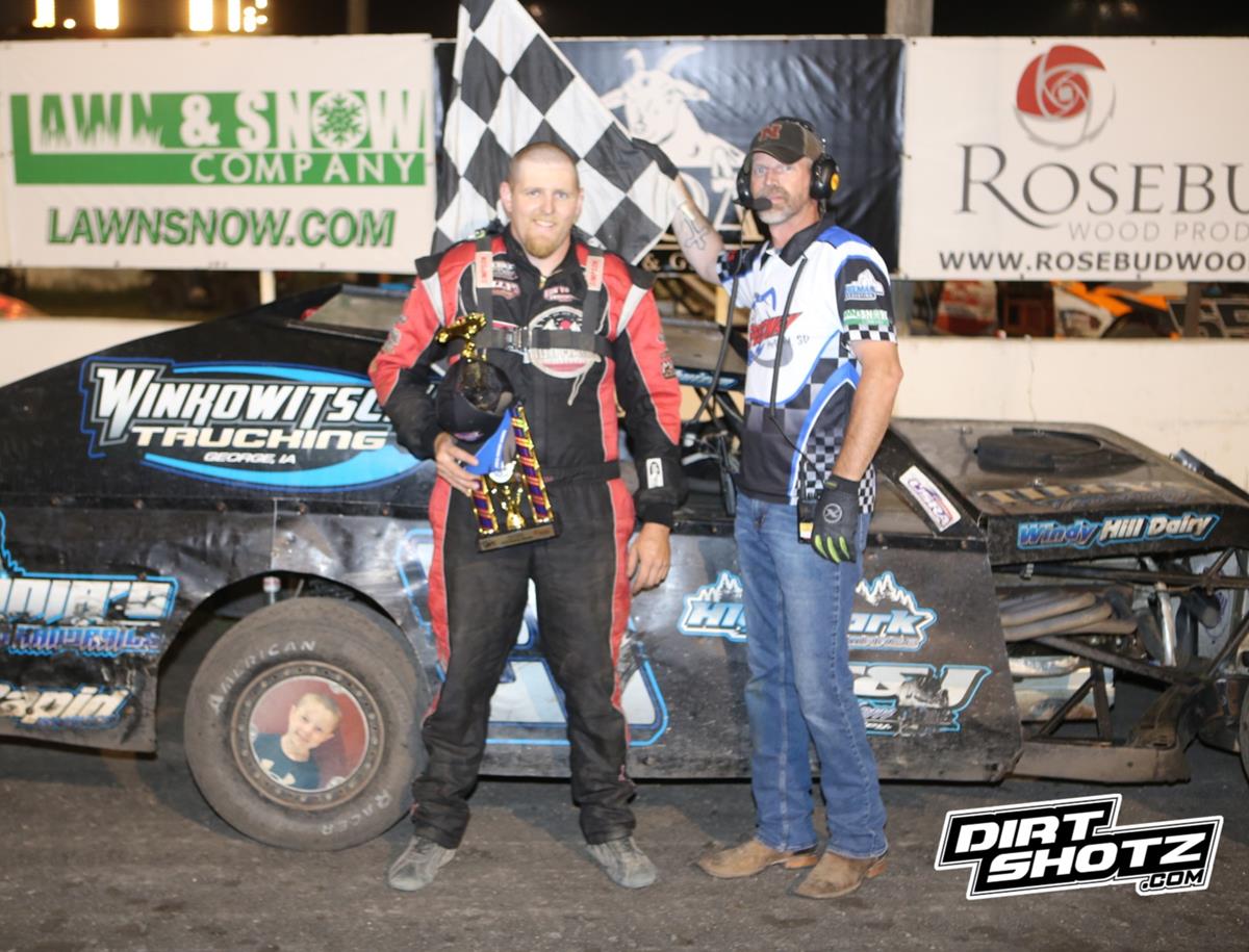 VanVendhuizen got the win in the B-mod main from the eleventh starting position. It took the former Rapid Speedway champion just five laps to get to the lead, but he wasn’t the only car charging forward. Duke Erickson raced from fourteenth to take second with Chase Alves going from seventeenth to third. Camden Myers went from twelfth to fourth and Click Erickson, who was out front for the first four laps, placed fifth.