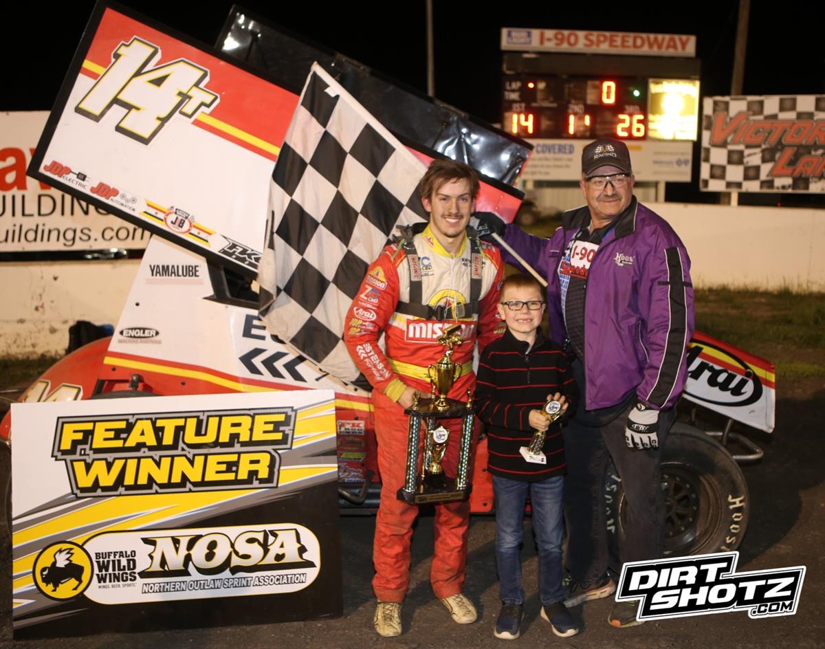 Tim Estenson topped the field Saturday night to get his first career 410 sprint car victory doing so with the Buffalo Wild Wings Northern Outlaw Sprint at I-90 Speedway. Nate Barger score the win in the IMCA Sprint Cars with Cory Yeigh victorious in the Late Model Street Stocks. Chris Goetz won the B-mod main and Dustin Gulbrandson was victorious in the Hobby Stocks.