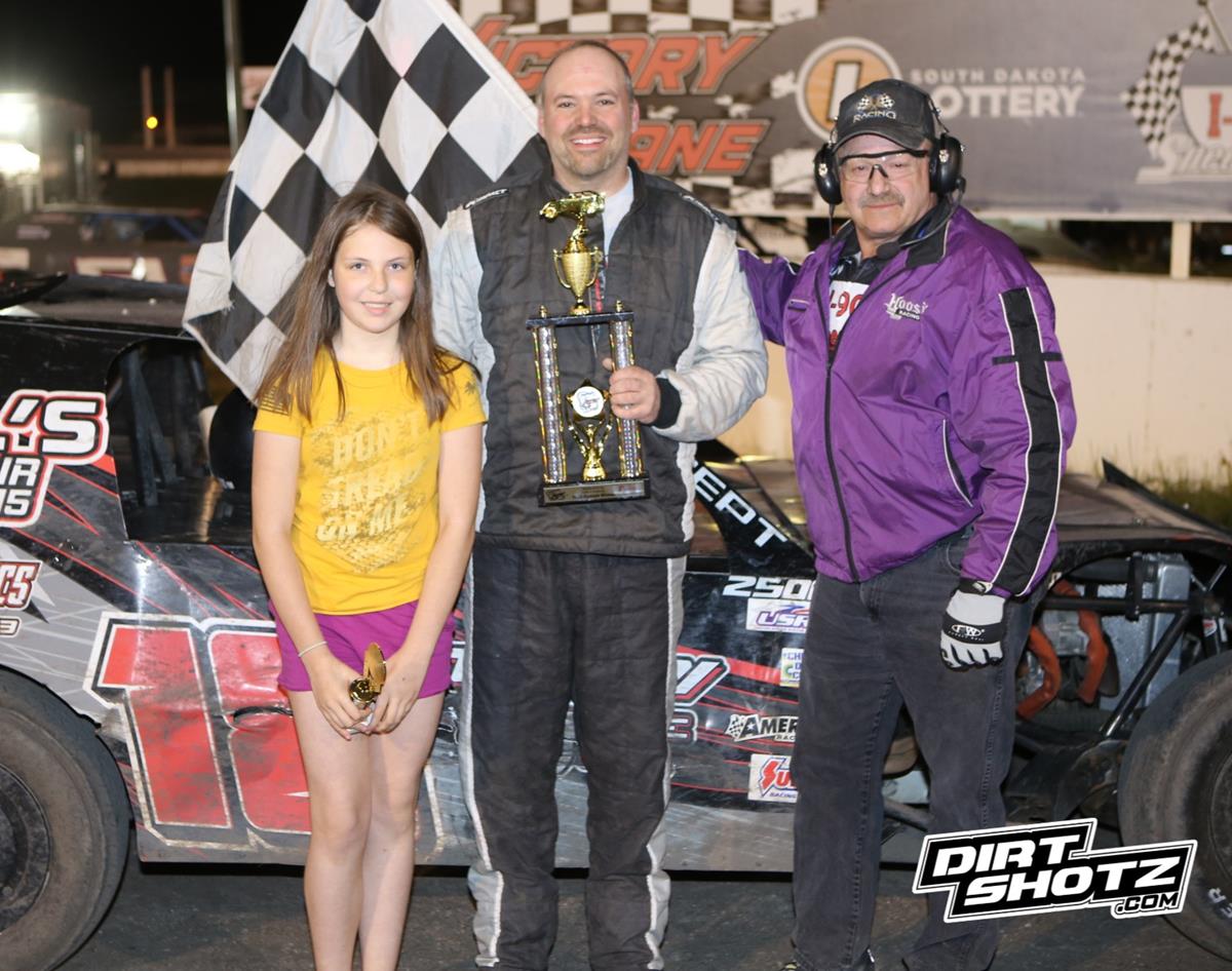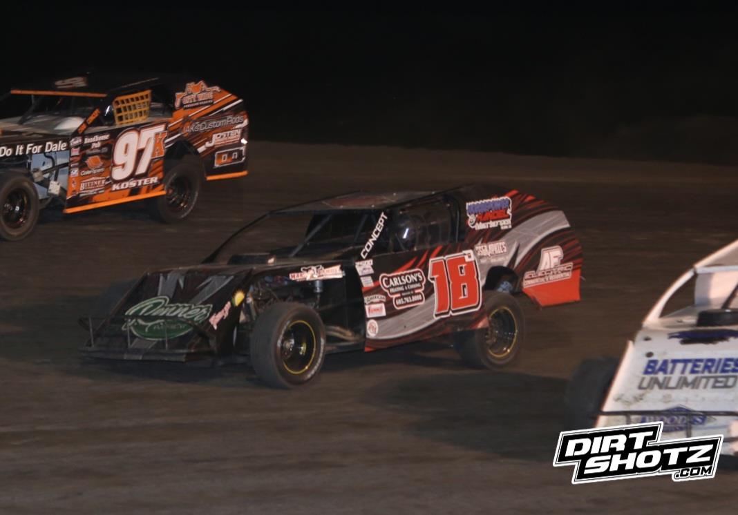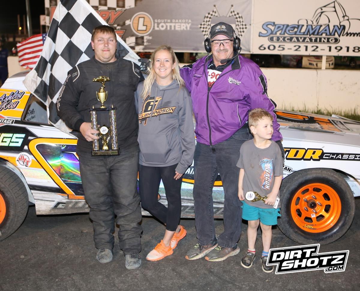 Yeigh immediately moved from fifth to first in the First Interstate Bank Late Model Street Stock main. He’d get his 36th career win at the track. Mike Chaney raced from tenth to second with Colby Klaassen going from eleventh to third. Matt Steuerwald raced from thirteenth to fourth with fourteenth starting Tracy Halouska completing the top five.
