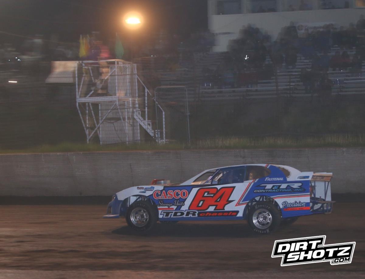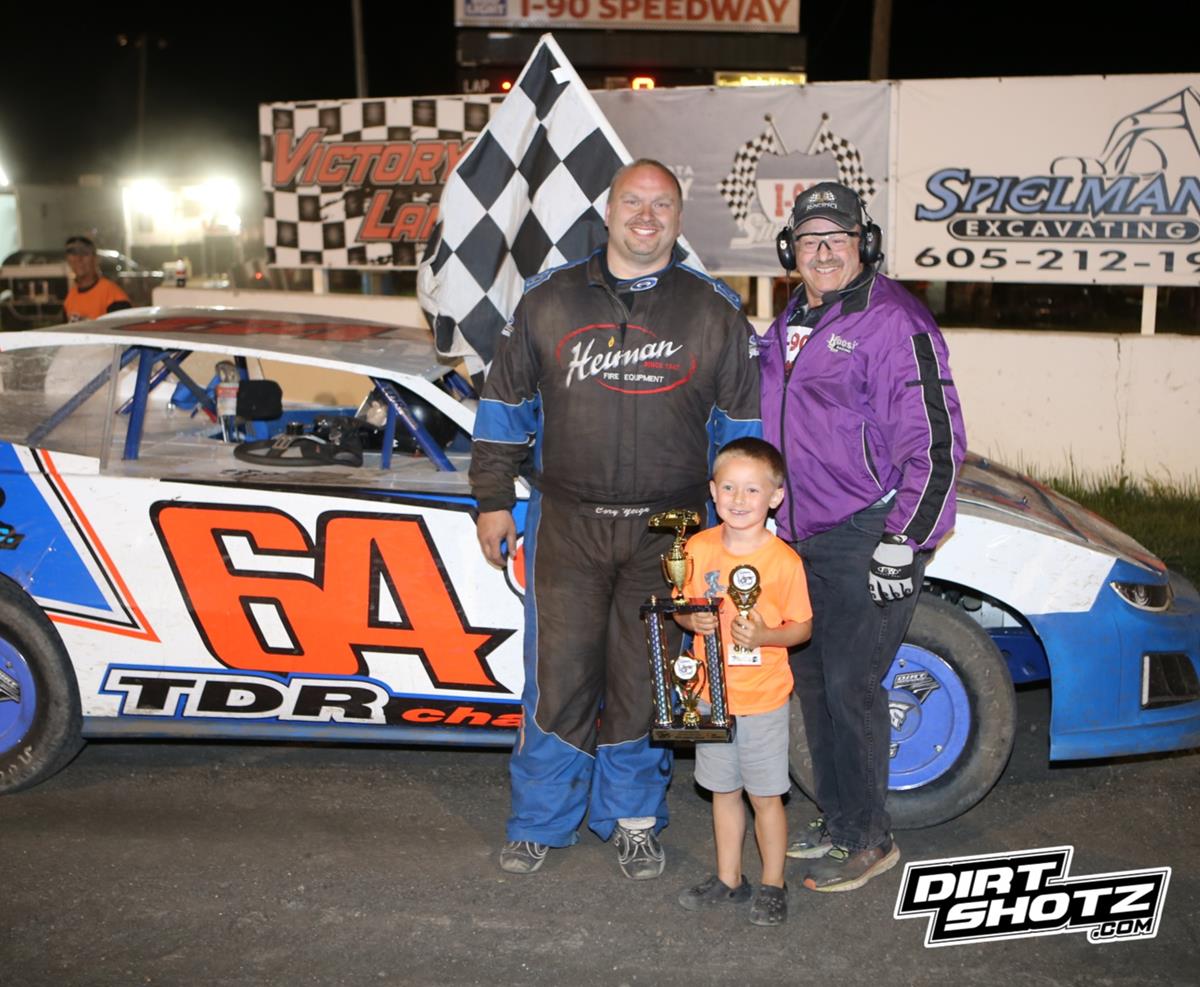 The win for Chris Goetz marked his first of his career at I-90 Speedway – taking over the lead on lap four of the Reaves Buildings USRA M-mod main. Goetz scored the win after starting in row four. Dave Kennedy started just behind Goetz and followed through the field to take second with Tanner Koster challenging for the lead multiple times and placing third. Duke Erickson and Derek VanVeldhuizen completed the top five.